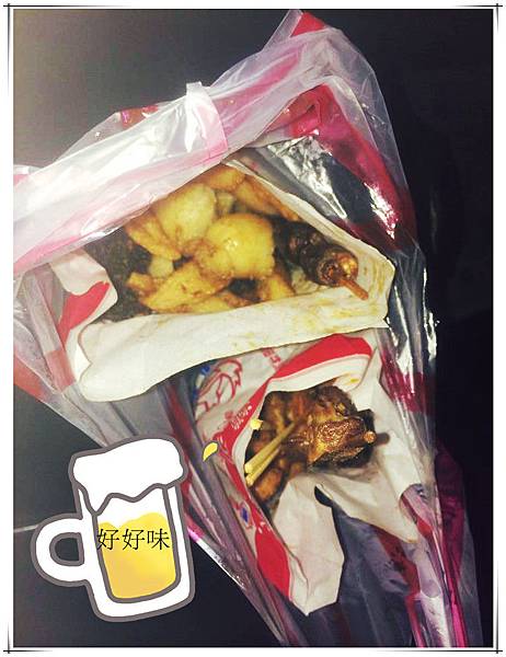 我點了一份鹹酥雞/魷魚/雞心/雞胗/雞屁股/甜不辣/豬血糕→→總共220大洋